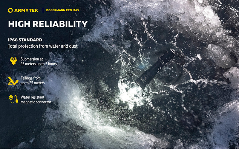 Conçue pour les opérations tactiques et le port quotidien, la Dobermann Pro Max est fabriquée en aluminium aéronautique avec finition mate anti-abrasive et bénéficie d'une protection IP68 contre l'eau, la poussière et la saleté ainsi qu'une résistance aux chutes de 25 mètres. Son bouton tactique électronique silencieux assure une discrétion totale lors des opérations.