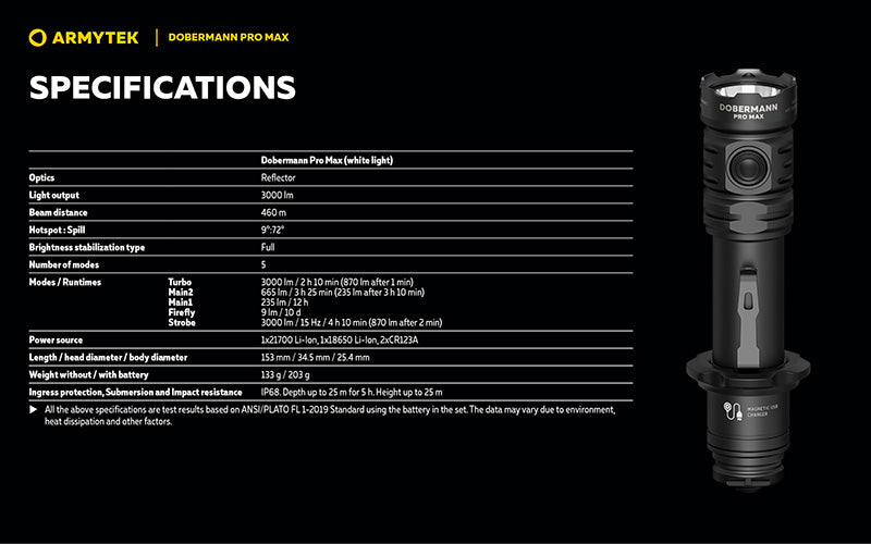 Rechargeable en seulement 2h45 via chargeur magnétique USB rapide, la Dobermann Pro Max est l'outil d'éclairage idéal pour les forces de l'ordre, militaires, agents de sécurité et utilisateurs quotidiens exigeant un équipement compact, fiable et tactique.